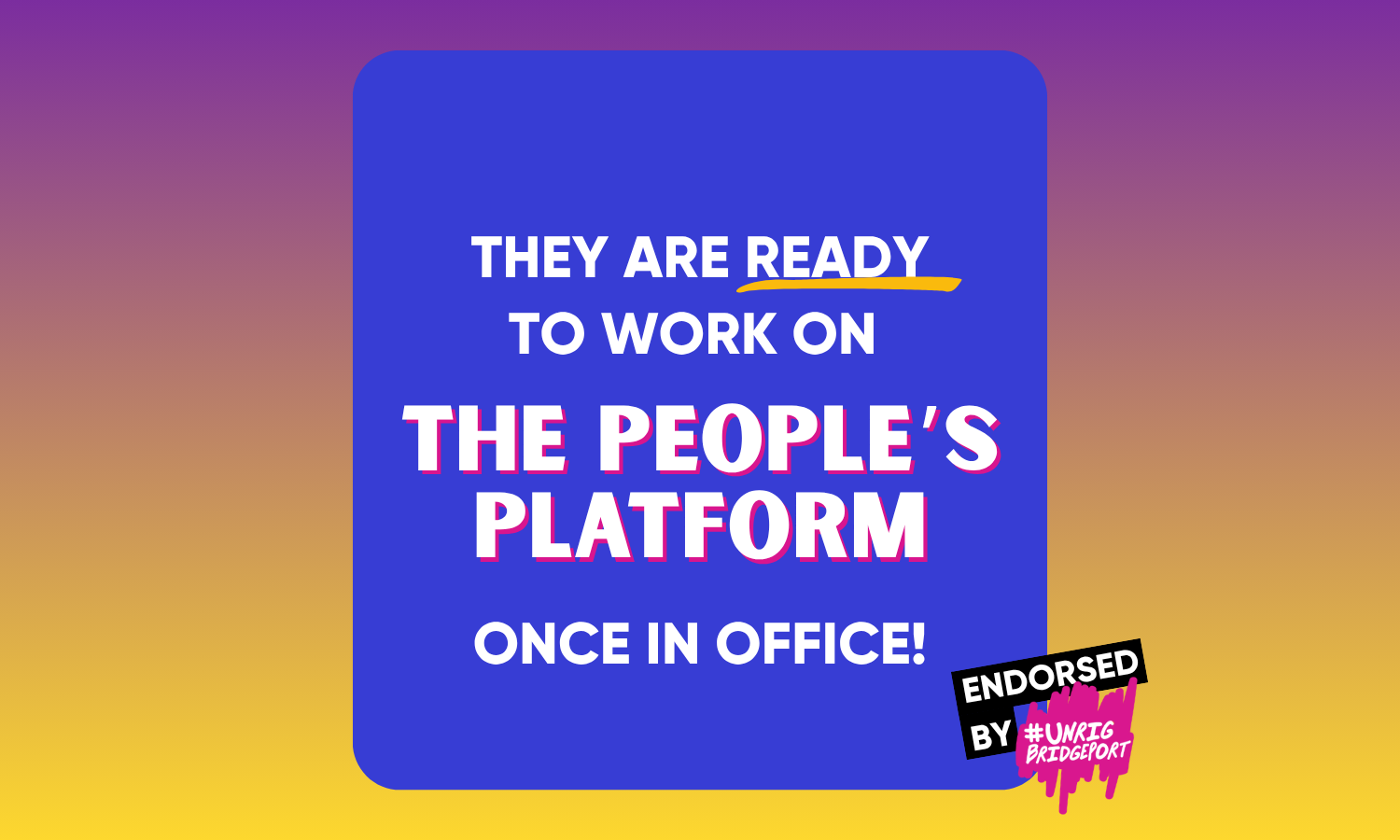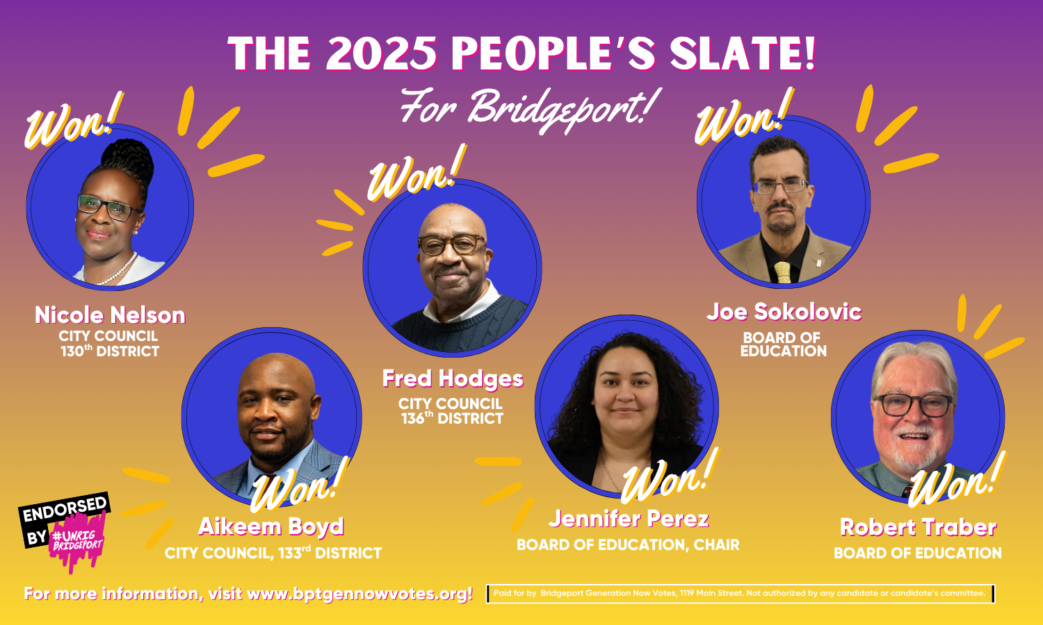 Bridgeport Generation Now Votes and the Unrig Bridgeport Coalition are committed to advancing the policies laid out in The People’s Platform. And so are the candidates who are part of The 2025 People’s Slate!